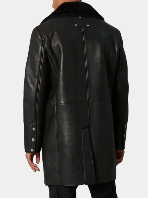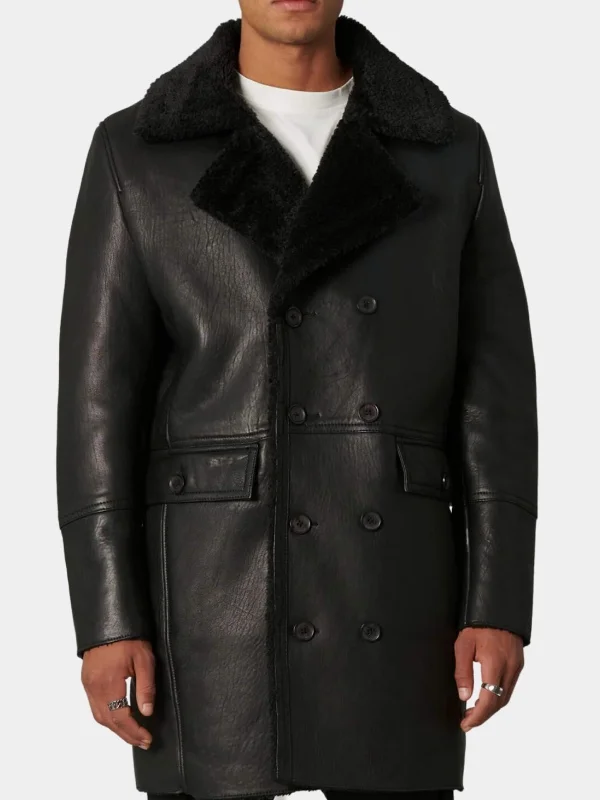Black Leather Double Breasted Shearling Trench Coat For Men