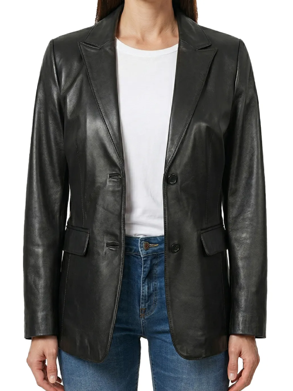 Women’s Two Button Real Leather Black Blazer